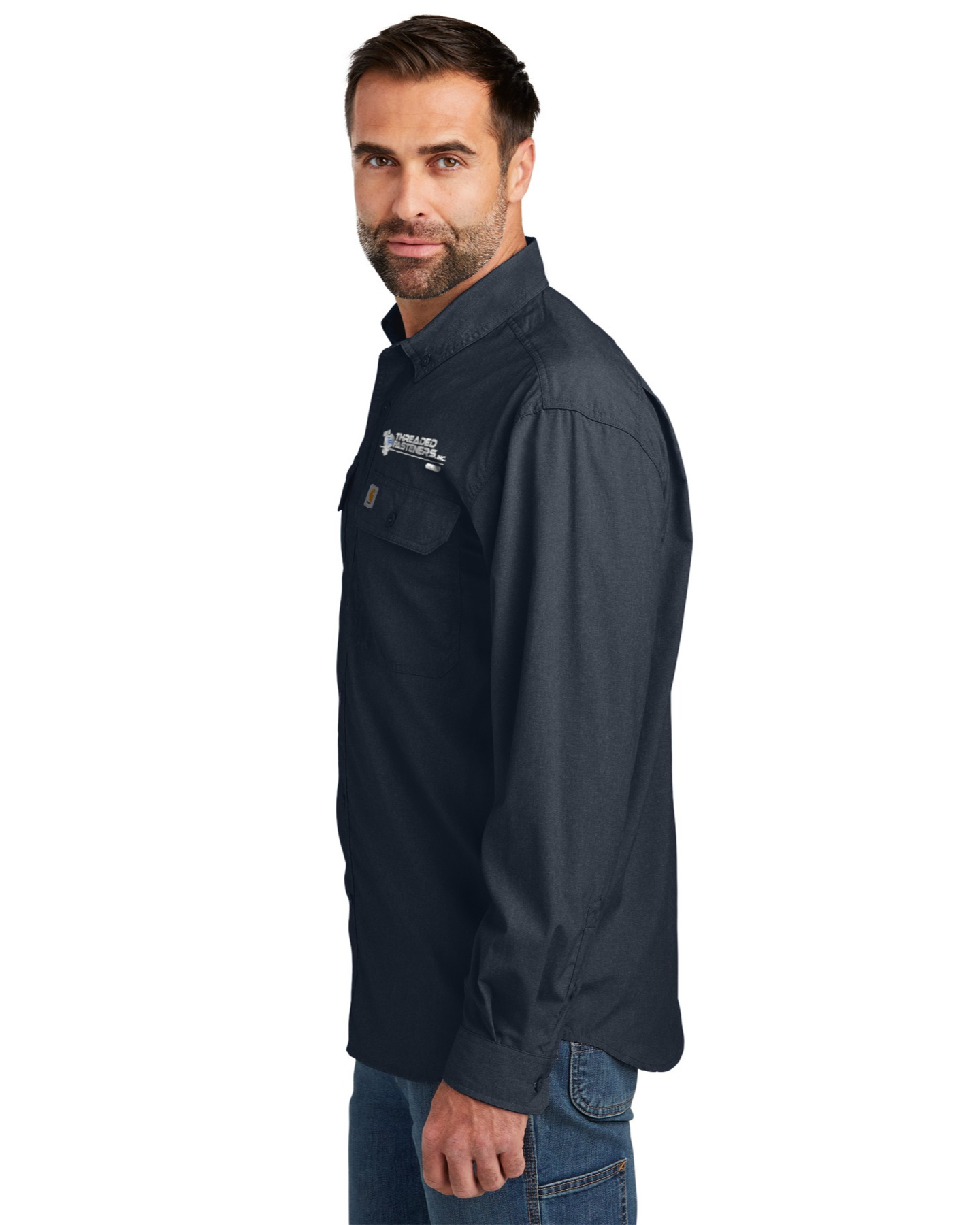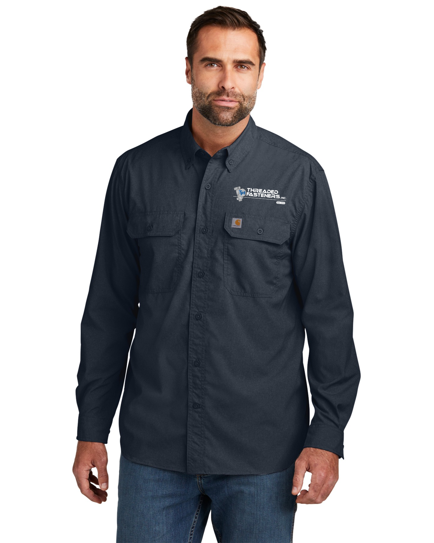 - Carhartt label sewn on left chest pocket