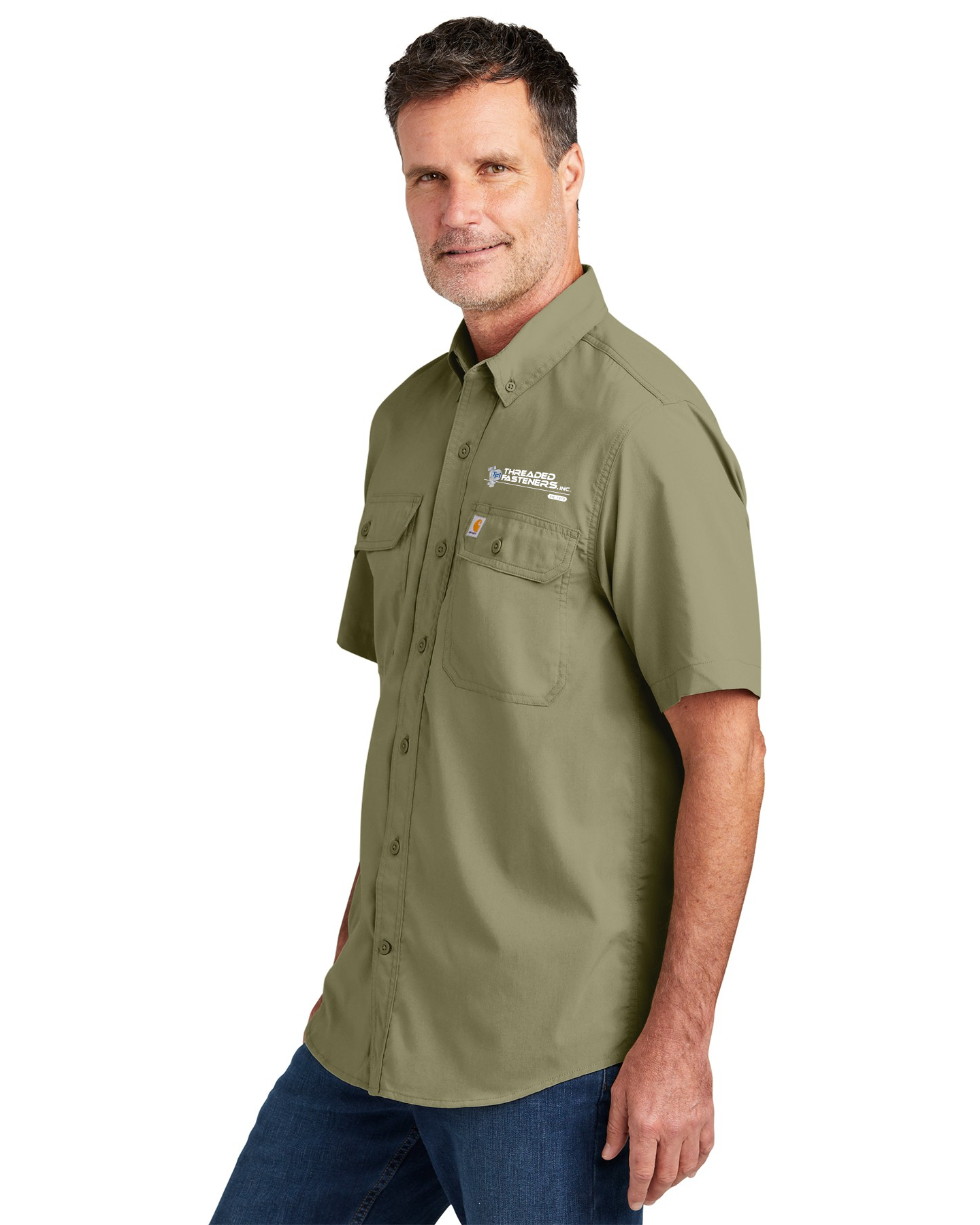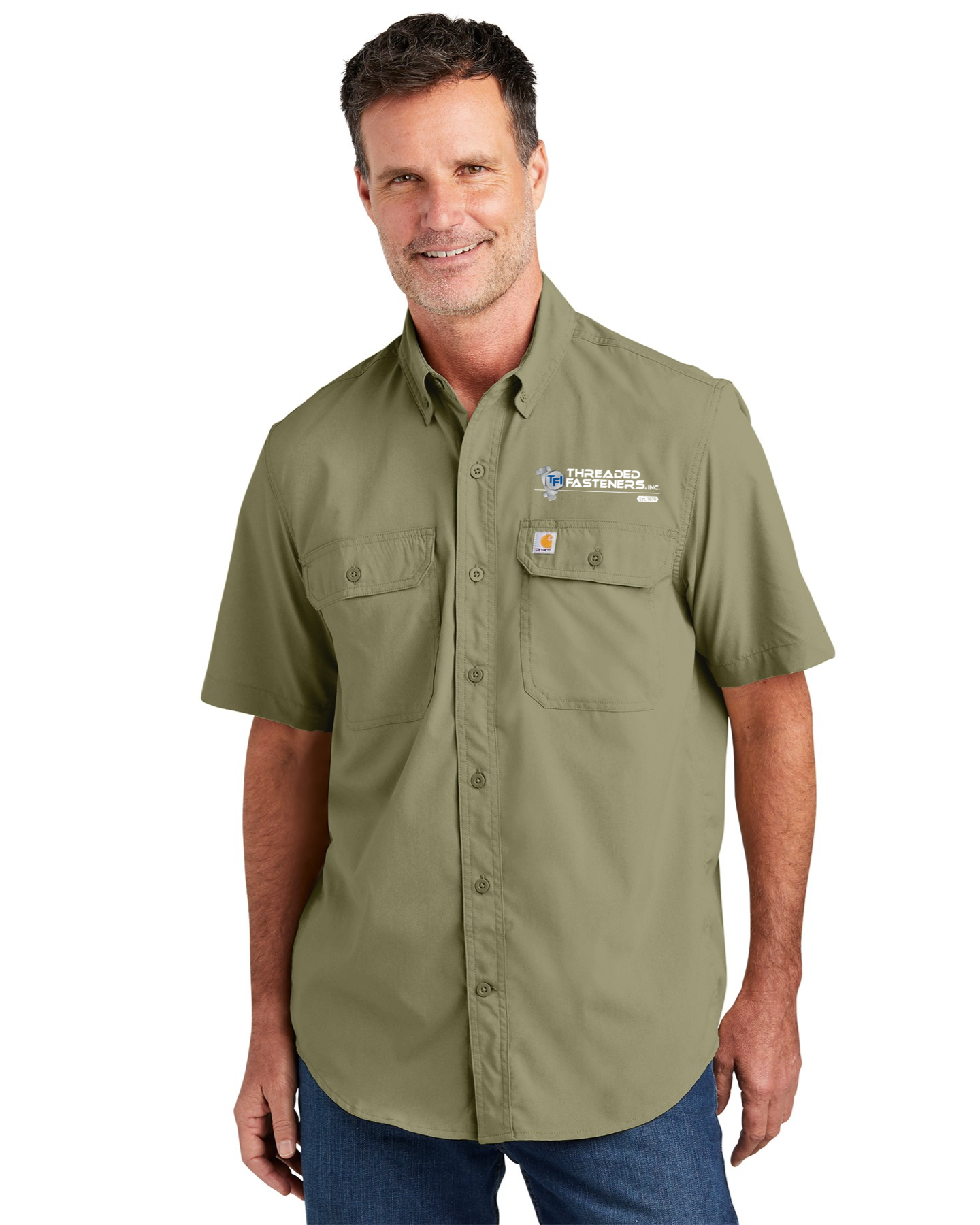 - Carhartt label sewn on left chest pocket
