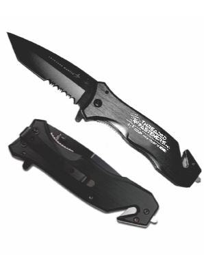 Utility knife with a partially serrated blade, spring assisted opening and pocket clip on back. Heavy duty stainless steel. Built-in seatbelt cutter and glass breaker.